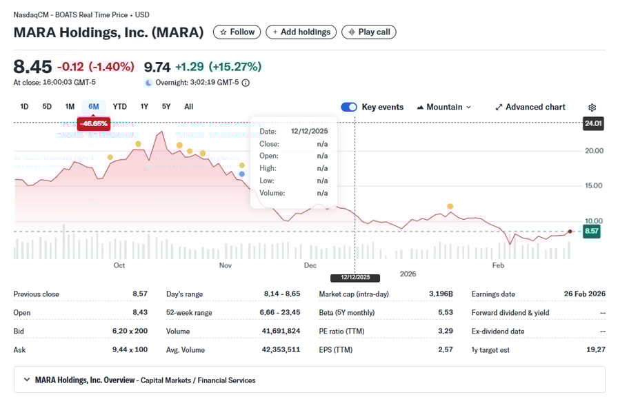 MARA Holdings (MARA) reported a fourth quarter 2025 net loss of $1.71 billion, or $4.52 per diluted share, compared with net income of $528.3 million, or $1.24 per diluted share, in the same period a year earlier.