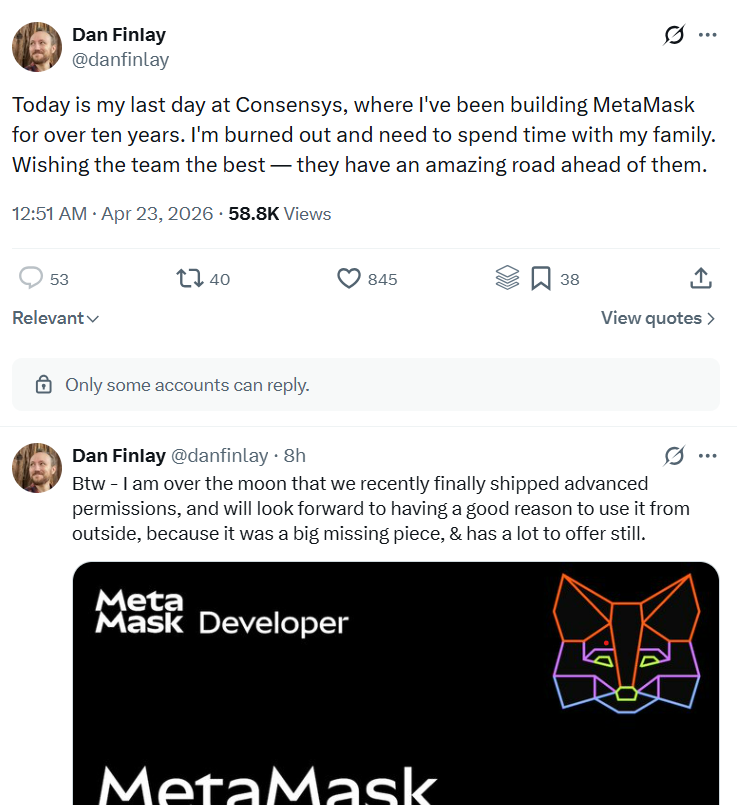 In a Thursday post on X, Finlay announced his decision and said that he wishes the MetaMask team “the best,” and believes they “have an amazing road ahead of them.”