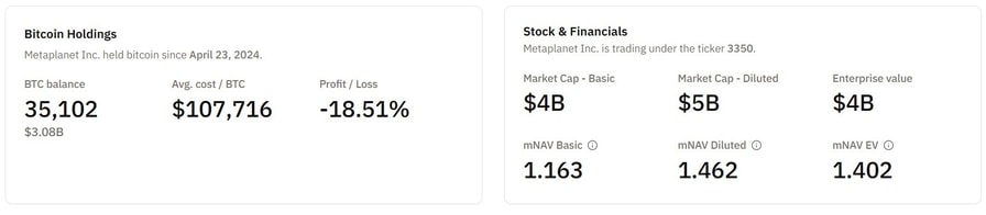 The company remains the fourth-largest corporate Bitcoin holder globally. According to Bitcoin Treasuries, Metaplanet holds 35,102 BTC, worth more than $3 billion.