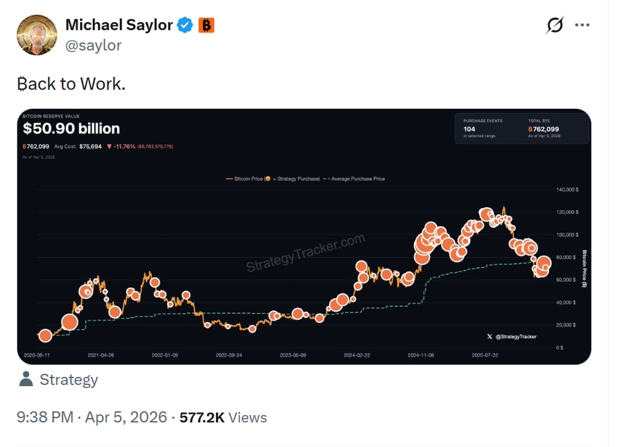 Michael Saylor has hinted his Bitcoin treasury firm is back on track with its weekly Bitcoin purchases after taking a rare week off at the end of March.