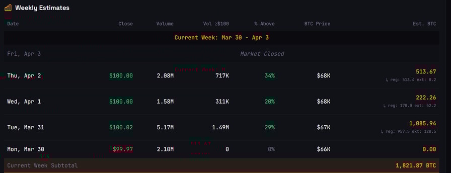 According to estimates from STRC.LIVE, Strategy could be set for a purchase of at least 1,821 BTC based on funds raised for the week ending April 3.