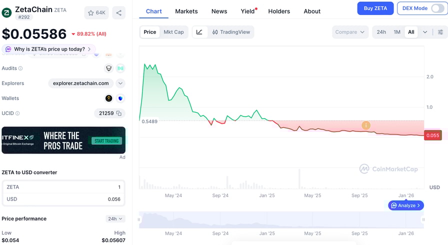 According to CoinMarketCap data, ZetaChain’s (ZETA) native token is down about 98% from its all-time high, while Berachain (BERA) has fallen about 95%. Monad’s token (MON) is trading around 52% below its peak, at the time of writing.