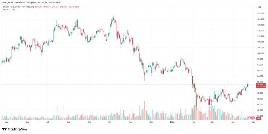 Bitcoin is down around 38% from its all-time high of $126,198 set in October 2025 and traded at $78,151 at the time of writing, TradingView data shows.