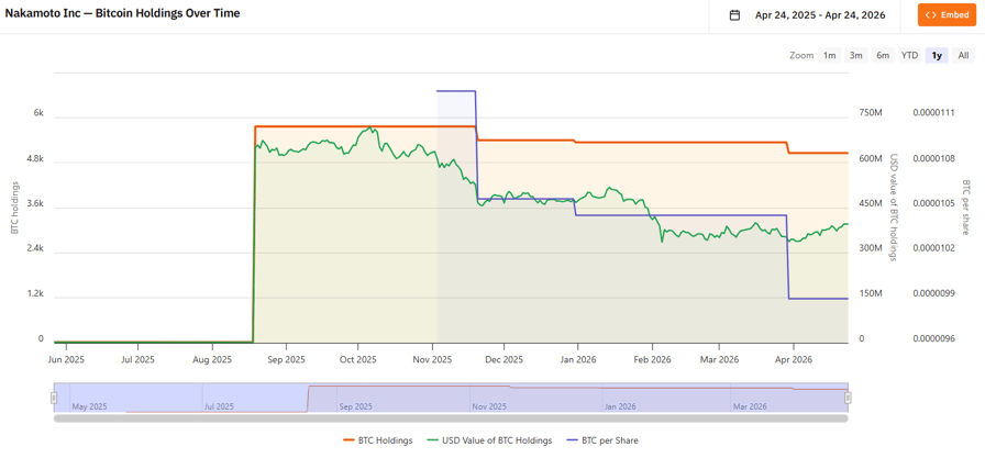 Nakamoto INC, Bitcoin holdings over time, 1-year chart. Source: Bitcointreasuries.net
