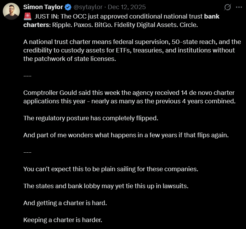 Speculation also surrounded stablecoin issuer Circle, which later denied that it had formally applied for a charter.
