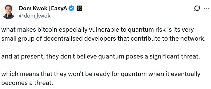 Some Bitcoiners, such as Strategy executive chairman Michael Saylor and Blockstream CEO Adam Back, believe quantum threats are overblown and will not disrupt the network for decades.