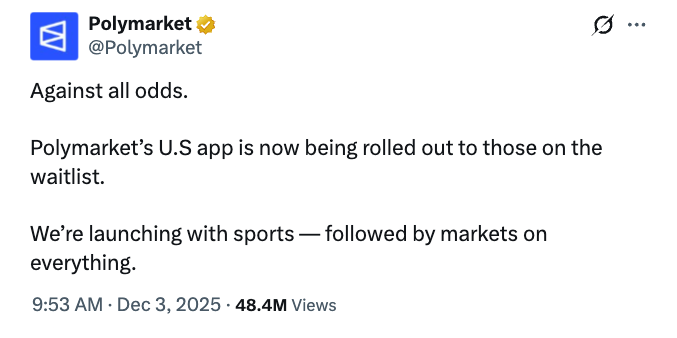 Polymarket has so far made limited progress in resuming US operations. In December 2025, Polymarket announced that its US app was rolling out with waitlist-only access. The app initially focused exclusively on sports contracts, with Polymarket saying it would be “followed by markets on everything.”