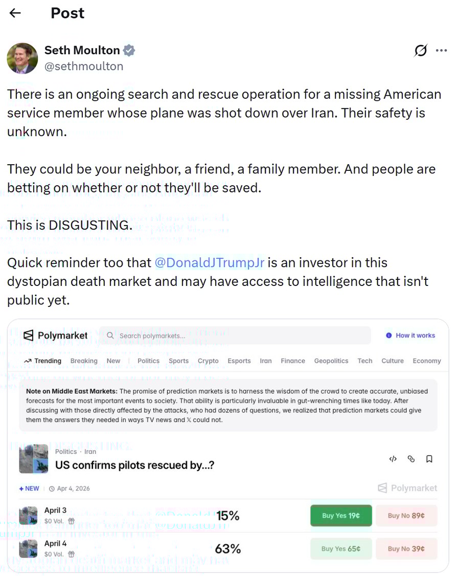 Representative criticizes Polymarket market. Source: Seth Moulton
