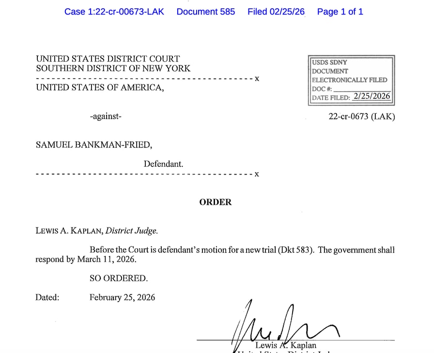 In a Wednesday filing in the US District Court for the Southern District of New York, Judge Lewis Kaplan said that the US government shall respond by March 11 to SBF’s motion for a new trial. The former FTX CEO, who was convicted of seven felony counts in 2023 and later sentenced to 25 years in prison, requested a new trial earlier this month, claiming that new witness testimony could help bolster his case.