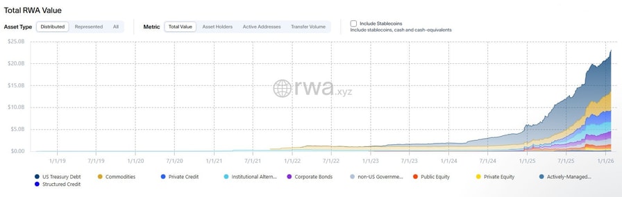 It is currently at an all-time high of $24.2 billion, excluding stablecoins, with 40% of that total in tokenized US Treasuries, 20% in tokenized commodities, 11% in tokenized private credit, and the rest in tokenized alternative funds, corporate bonds, non-US government debt and private and public equity.