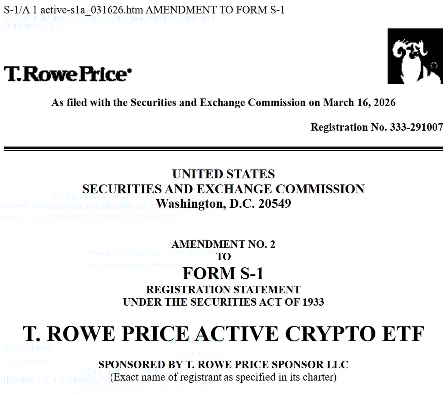 T. Rowe Price, the $1.8 trillion asset manager best known for managing mutual funds and retirement accounts, has amended the registration statement for its proposed Active Crypto exchange-traded fund (ETF), updating a prospectus first submitted in October that outlines plans for an actively managed fund investing directly in digital assets.