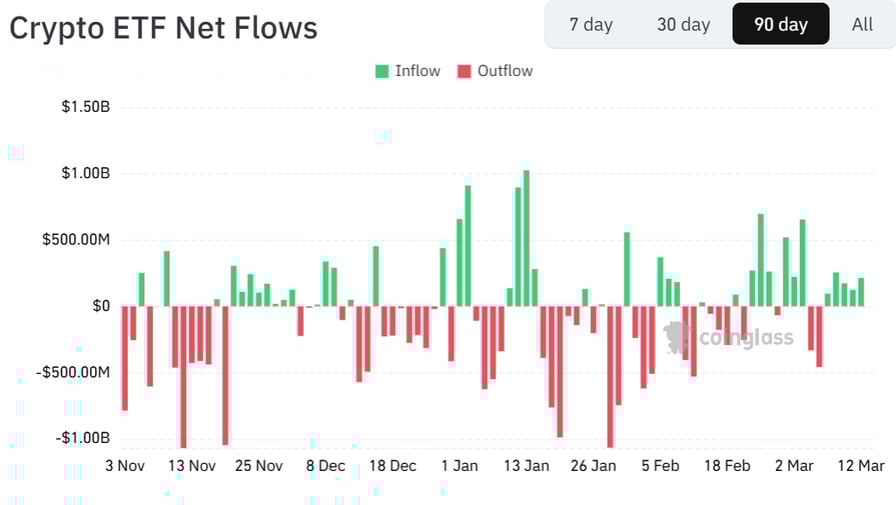 After a turbulent five months, net inflows into crypto ETFs has flipped positive in recent weeks. Source: CoinGlass