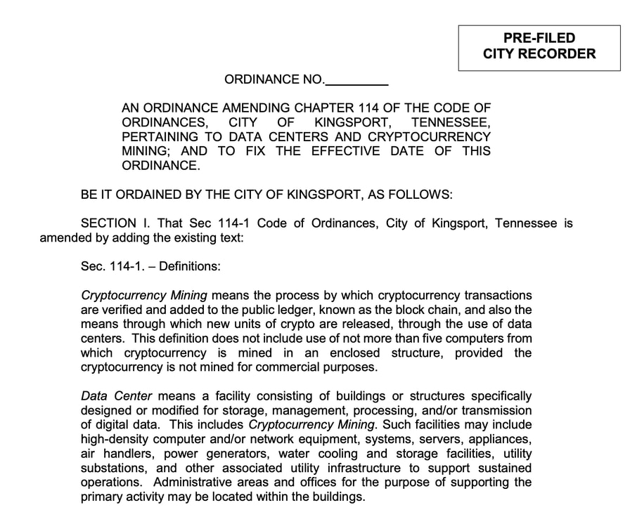The Board of Mayor and Aldermen in Kingsport, Tennessee approved changes to the city’s zoning rules that could pave the way for cryptocurrency mining companies and data centers to operate locally.