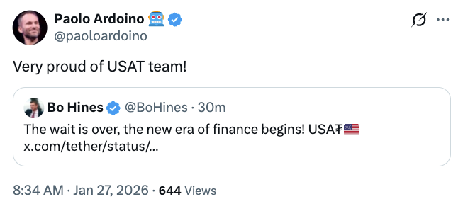 In last September’s announcement, Tether revealed that Bo Hines — who previously led Republican President Donald Trump’s Council of Advisers on Digital Assets — would assume the CEO role at Tether USAt.