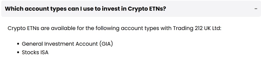 Trading 212 explains which account types can access crypto ETNs. Source: Trading 212