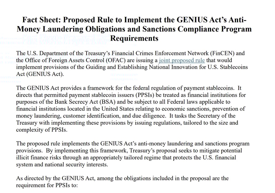 In a Wednesday notice, the US Treasury Department said its Financial Crimes Enforcement Network and Office of Foreign Assets Control (OFAC) had issued a joint proposed rule to implement provisions of the GENIUS Act, signed into law in July 2025.