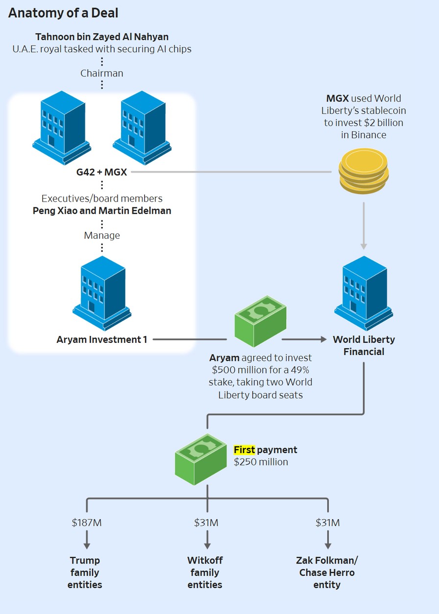 The Journal reported that executives from G42 helped manage Aryam Investment 1 and took board seats at World Liberty as part of the deal, making Aryam the startup’s largest outside shareholder. Weeks before the US-UAE chip framework was announced, another Tahnoon-led firm, MGX, used World Liberty’s stablecoin to complete a $2 billion investment into Binance.