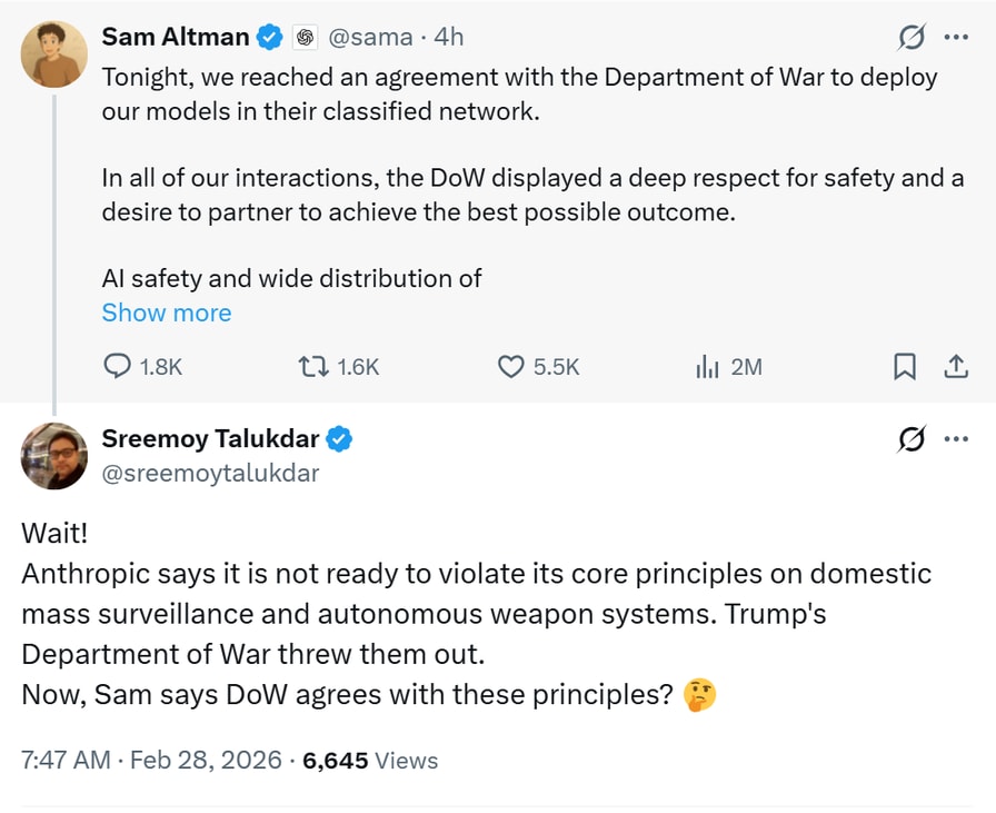 OpenAI faces backlash after reaching deal with US military. Source: Sreemoy Talukdar