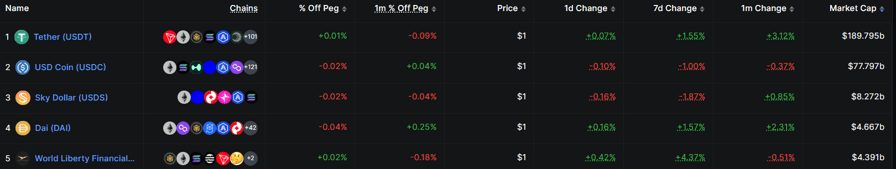 Tether's USDt (USDT) leads with a market cap of more than $189.7 billion, followed by Circle's USDC (USDC) at $77.7 billion and Sky Dollar at $8.2 billion, according to DeFi analytics platform DefiLlama.