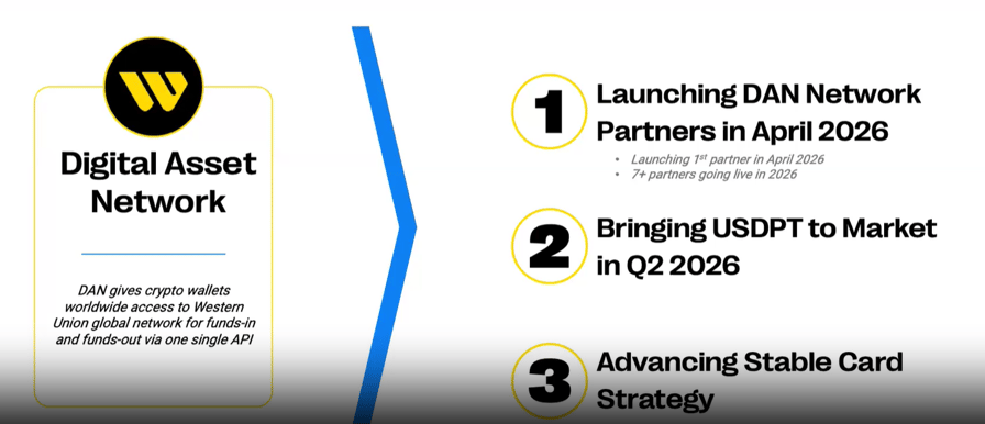 McGranahan added that Western Union’s digital asset network (DAN), which aims to allow stablecoins and other cryptocurrencies to move across its global payment system and link to real-world cash access, will add its first partner this week.