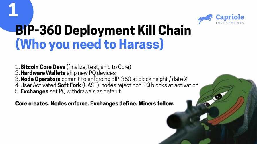 To address the perceived quantum computing threat, a group of Bitcoin advocates and crypto fund managers started championing the Bitcoin Improvement Proposal known as BIP-360, which would introduce a post-quantum signature option for Bitcoin addresses that could be vulnerable to future advances in quantum computing.