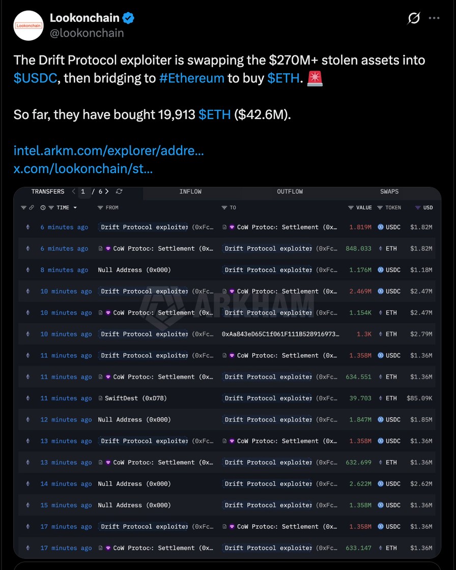 Circle failed to freeze $232 million in illicit flows from the Drift Protocol Hack on Wednesday, despite a six-hour window in which the attackers converted USDC to ETH in over 100 separate transactions, he added.