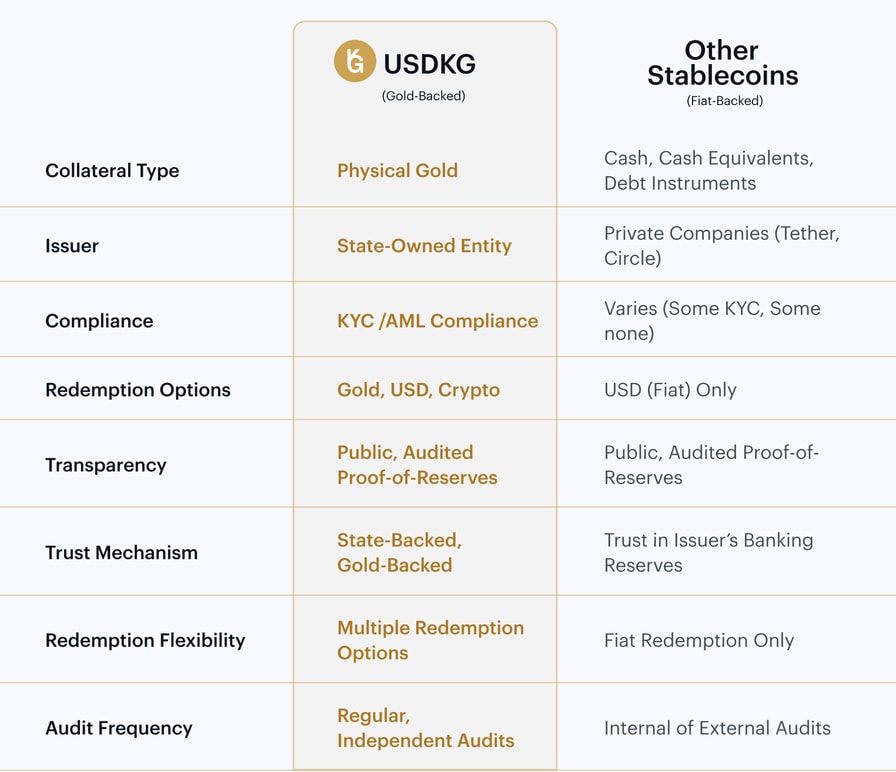 At the core of Kyrgyzstan’s Web3 strategy is USDKG, pegged 1:1 to the US dollar and fully central bank-grade gold held at the largest private bank in the country. Unlike other gold-backed tokens, it doesn’t fluctuate with bullion prices. Instead, it offers fiat-like usability grounded in hard reserves.